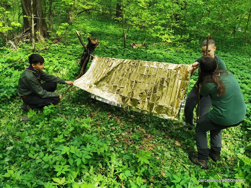 cutezatorii au trecut la o tema de supravietuire: realizarea unui adapost improvizat folosind folia termoizolanta din dotare.